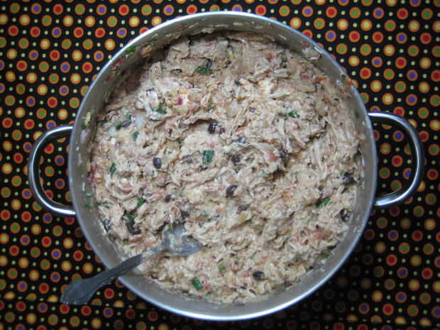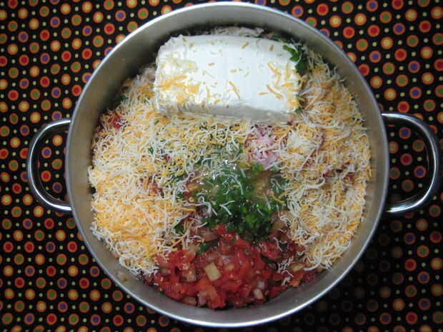 ~ Combinar el queso crema, trocitos de verduras, frijoles, pico de gallo, especias, queso rallado, bañe con la mitad de salsa de Chile verde y mezclar hasta que la pasta deseada. (sabor para asegurarse de que es lo siempre ha soñado!)