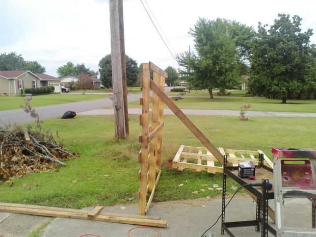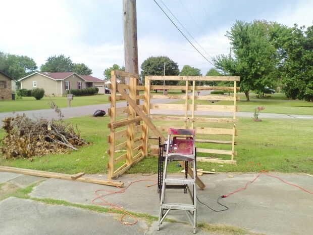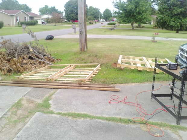 Me expuso las paletas y empecé sujetando un trozo largo agradable de 2 x 4 a un extremo del plataforma frente. Levantó la paleta y dejar recostarse un poco contra el tablero. Esto mantiene la plataforma en lugar mientras estaba parado hasta la segunda plataforma en ángulo recto a la primera y atornillar los dos juntos. Algo que me di cuenta rápidamente era que necesitaba para cortar de la proyección de las lamas en la plataforma lateral en la parte delantera que podría correr tornillos a través de los listones en la plataforma delantera en el bastidor en la segunda plataforma que fue expuesta por los cortes. Esto hace que la articulación bastante sólido.