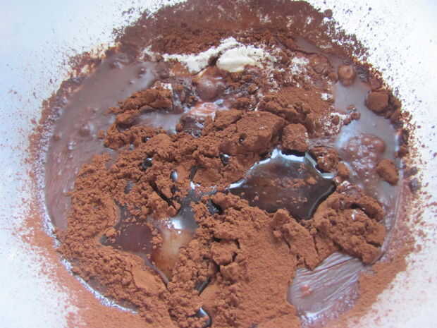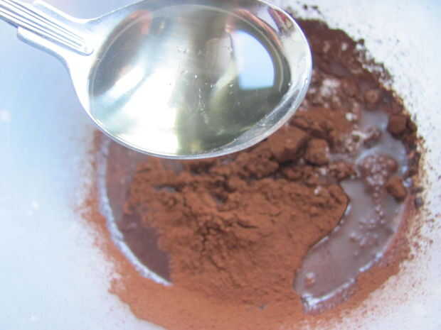 Poner todos los demás ingredientes (3 cucharadas soperas de agua, 2 cucharadas de aceite) en el recipiente con la mezcla de ingredientes seco.