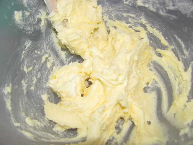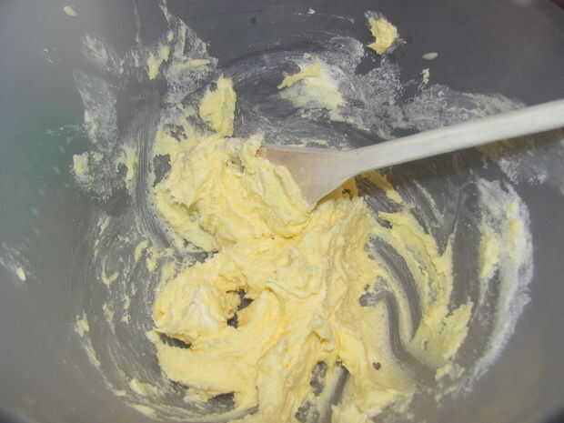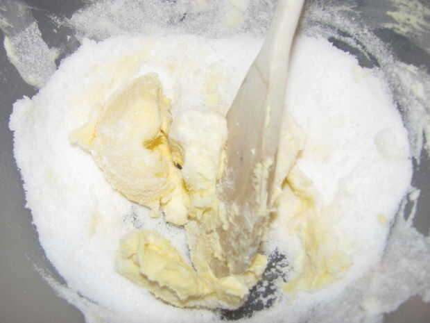 Añadir 150g de azúcar y la mantequilla en un tazón y mezclar con una cuchara de madera.