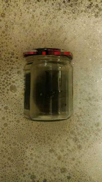 3) sumerja la jarra con la película pegajosa en agua jabonosa caliente y luego usar una esponja de metal para limpiar la película de. Usé un cepillo metálico utilizado para la limpieza de la parrilla y logró cortar mi dedo en el proceso. Supongo que ningún dolor, ninguna ganancia.
