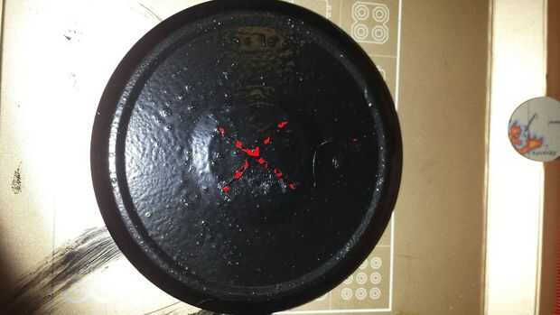 2) dibuja una X en el centro de la tapa con las dos líneas ligeramente más cortas que la longitud del diámetro de la base del émbolo...