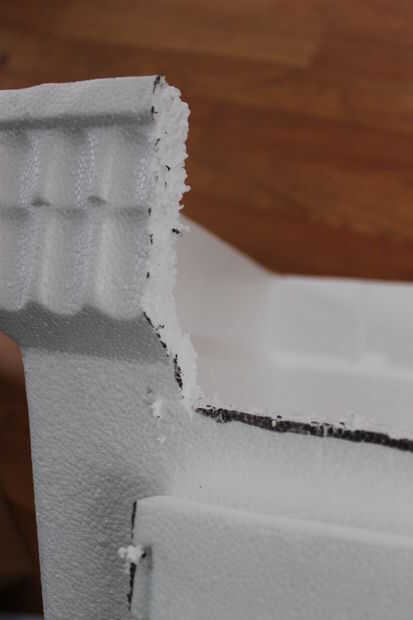 2. Corte cuidadosamente a lo largo de su marca con cúter. No ser demasiado fuerte o se puede romper el enfriador. Limpie cualquier granos flojos de espuma de poliestireno. Imagen 2-3