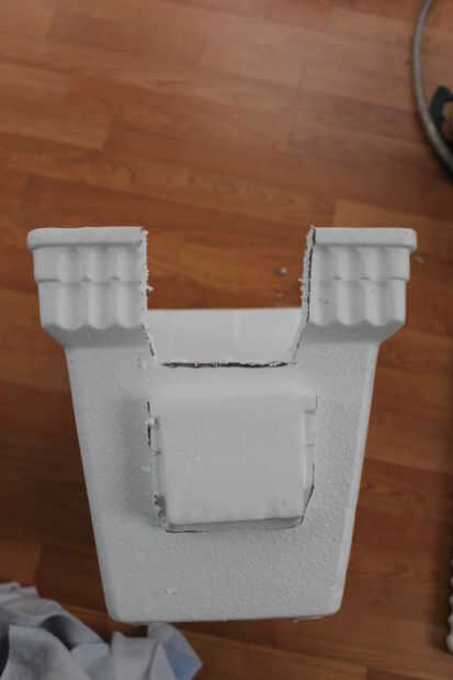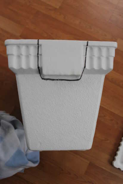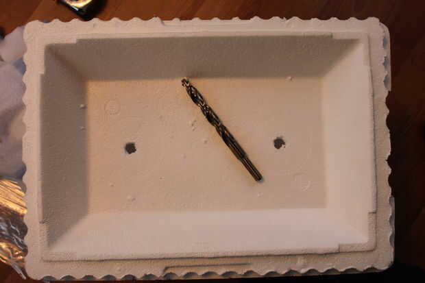 1. en la tapa (yo usé las marcas de inyección de espuma de poliestireno), marque los dos orificios. Orificio de 1/2" usando cualquier instrumento que tiene a mano; un pedacito de taladro, lápiz afilado, ect... Imagen 7-8
