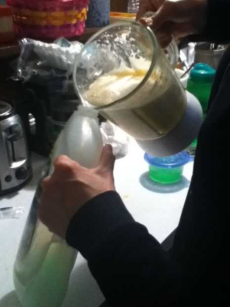 Cuando tengas todos los ingredientes mezclados para arriba te tienes que poner en un recipiente. Mayoría de la gente utilizaría una botella de spray, pero el repelente atasca las botellas del aerosol, usé una botella de jabón de plato grande (con el repelente en poco de jabón no es mala porque venados no les gusta ya sea jabón). Cuando todos los ingredientes en la botella llenar el resto de la botella con agua. Entonces usted que el repelente se siente por un par de días por lo que puede fermentar.
