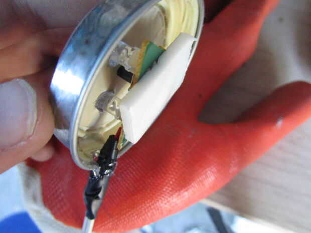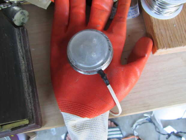 Instale el soporte de la batería en la parte posterior del guante con cinta de doble cara. Poner cinta de doble cara en la parte inferior de los LEDs y pegar el botón en la tapa, no pegar los LEDs porque tienen que ir hacia arriba y hacia abajo cuando se pulsa el botón. Pegue la luz a la palma del guante y añadir poco de pegamento en el borde de la tapa para que se vea bien.
