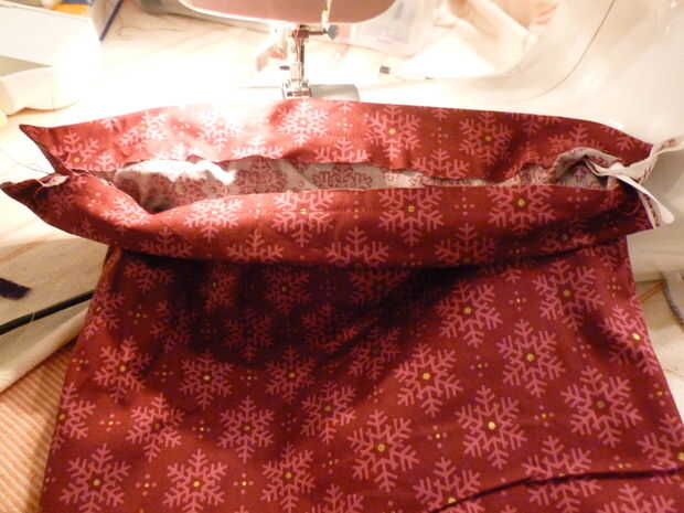 Doble la tela de modo que los lados del derecho juntos. Otra vez, si eres el tipo de persona que necesita para, siga adelante y hacerlo ahora. Coser a lo largo de los bordes abiertos. Girar el bolsa derecha-lado-hacia fuera. Ahora la bolsa debería verse como una bolsa aparte de la falta del lazo.