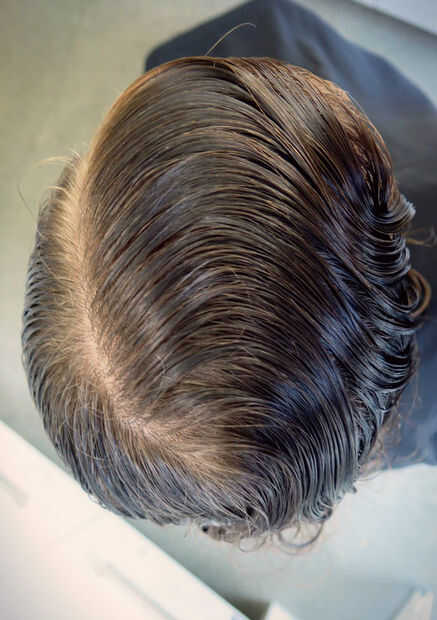Inicio con el pelo mojado. Crear una parte lateral profunda Su cabello querrá probablemente naturalmente parte más fácilmente en una dirección en lugar de otro. Vaya con lo que se ve y se siente mejor. Pelo de ama ya estaba en una parte lateral profunda a la izquierda, así que hice más profundo para acentuar la ola más grande por encima de su frente.