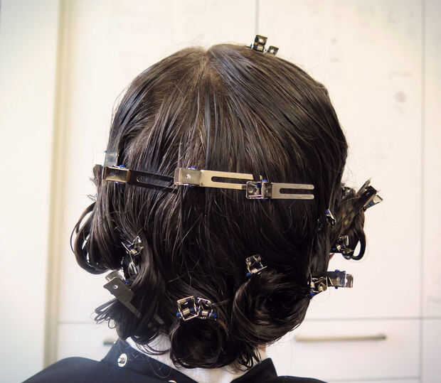 a continuación, divida el cabello colgando por debajo de los clips en cinco secciones. Para la mirada de la Ama, creó todo el mismo tamaño.