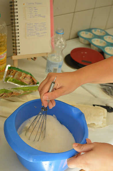 Paso 6: Añadir el aceite/derretir mantequilla y polvo de hornear/backpulver. De la mezcla.