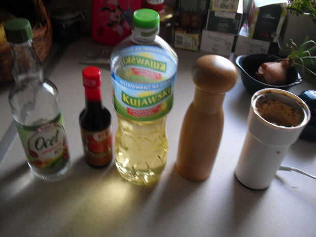 4 cucharadas de salsa de soja (yo usé oscuro) mantequilla de maní 2 cdas vinagre de vino blanco 2 cucharadas 2 cucharaditas de aceite de sésamo 1 cucharada sopera de miel Poco de ajo en polvo o simplemente plin ajo (no usar este uno-mi hermana no le gusta la comida picante)