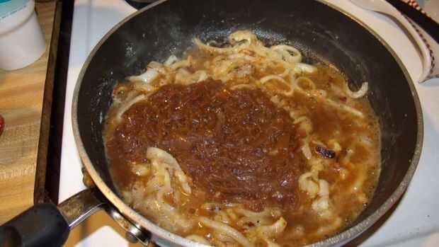 rebanada de ambos extremos de la cebolla o cebolla, cortarla por la mitad y luego en medias rodajas finas, añadir una cucharada de mantequilla y aceite de oliva a una sartén y cuando comienza a shimmer añaden las cebollas en rodajas, cocinar a fuego medio bajo hasta que se doren (podría añadir una pizca de azúcar y cocinar hasta el marrón oscuro y uso untar sobre una tostada) Añadir una cucharada de harina y revuelva , cocinando hasta que la forma de una pasta (roux) luego agregar 2/3 de una lata de sopa de cebolla francesa condensada, mezclar hasta que se calienta y espesa... alrededor de 2 minutos"y quitar la salsa a la prueba de horno, hornear