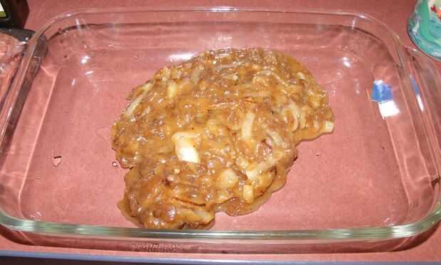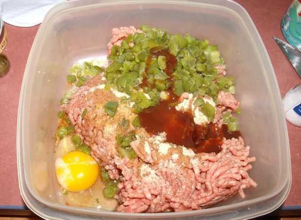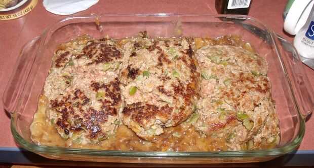 mezcle la carne molida, 1 huevo, 1/2 taza pan rallado, pimientos, churrasco y worchestershire salsas sal y pimienta y reserva 1/3 lata de francés sopa de cebolla, mezclan bien y forman las hamburguesas, mina son aproximadamente 6 x 3 x 3/4" que permitió 3 caber en mi plato con cierta izquierda sobre mezcla para otra, dependiendo del tamaño de su familia podría hacer hasta 10 hamburguesas. En una sartén caliente, cocine a fuego med alto hasta que doren o unos 3 minutos por cada lado entonces hacia su plato de prueba de horno lleno de salsa, cubrir el plato con una tapa o con papel aluminio y hornee a 350f por 30 minutos, retire el envoltorio y volver al asador durante 3-4 minutos