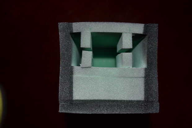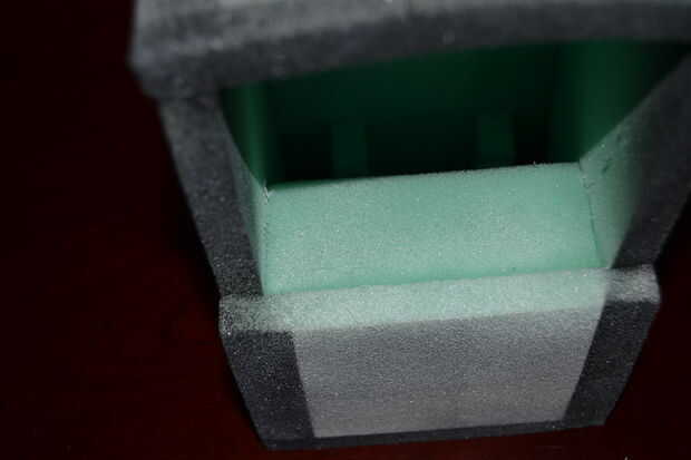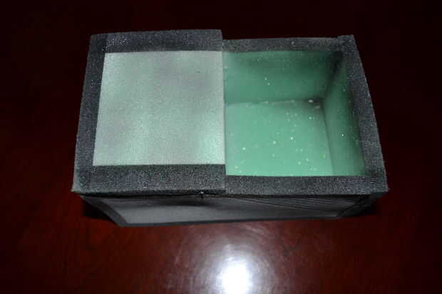 Siguiente de la inserción del agarre de brazo, muñeca (esta parte mantiene los guanteletes de caerse). Tomar una tira de 1,75 "x 3" y pegamento caliente en la abertura detrás del guante toca la 4 "x 5" fondo espuma Plaza interior borde. Luego tomar otra tira de 1,75 "x 3" y pegamento caliente en el guante en el otro extremo de la Plaza de 4 "x 5" (ahora tiene una caja abierta dentro de una caja si se hace correctamente). Use una escuadra de 4 "x 4" y ahora pegamento caliente a través de las tapas de las dos 1,75 "x 3" plazas para cerrar apagado.