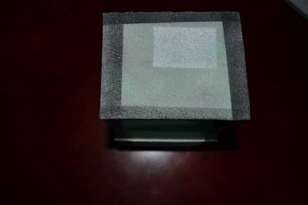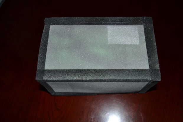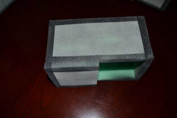 El objetivo de este paso es hacer un 8 "x 5" x4.5 "forma de caja de la espuma. Después de que ha cortado las piezas espuma Coloque un 4" x7.5" rectángulo en un plano de la superficie y proceder a pegar un 4" x7.5" lateral a lo largo de la parte superior "borde de 4" x7.5 exterior"" asegurándose de que los extremos y los bordes de ambas piezas se alinean uniformemente. Pegar toda la longitud del borde de la espuma hacia abajo en una distancia corta de trabajo a la vez para evitar que el pegamento caliente enfriamiento demasiado rápido.
