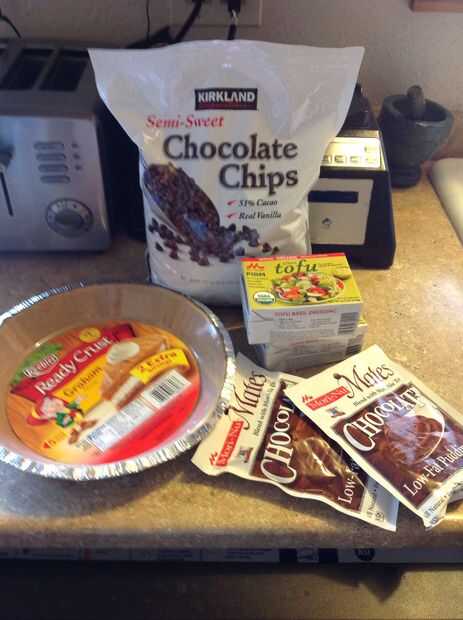 Una costra graham cracker (estaba en un apuro así que compré la mía); dos cajas de tofu silken MoriNu, dos paquetes de MoriNu pastel de mezcla (tienen otros sabores, como vainilla y caramelo); y dos cucharadas de chocolate chips. (Mi supermercado lleva generalmente el tofu MoriNu y mezcla de pastel, pero a menudo son, por lo que encontré en Amazon a granel y ahorrado dinero.)