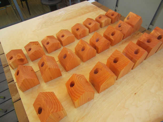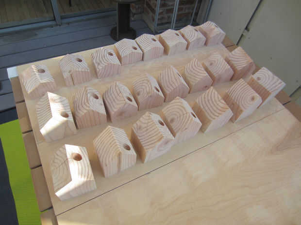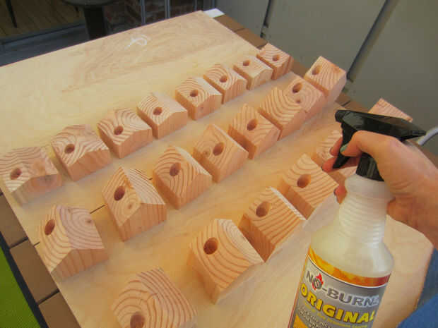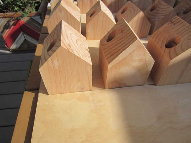 No estoy seguro si rociar demasiado o qué, pero a la mañana siguiente mi casas tenían estos puntos de cristales blancos sobre ellos, así que tuve que lijar todo de nuevo. No importa demasiado, el chorro había levantado el grano y hubiera tenido que lijar de todas formas otra vez.