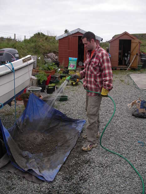 Usé una proporción de mezcla de 5 partes en lastre a 1 parte de cemento, que compara a cubos dos constructor de lastre y a menos de la mitad un balde de cemento. Estos fueron objeto de dumping en la lona y una cantidad de agua agregada.