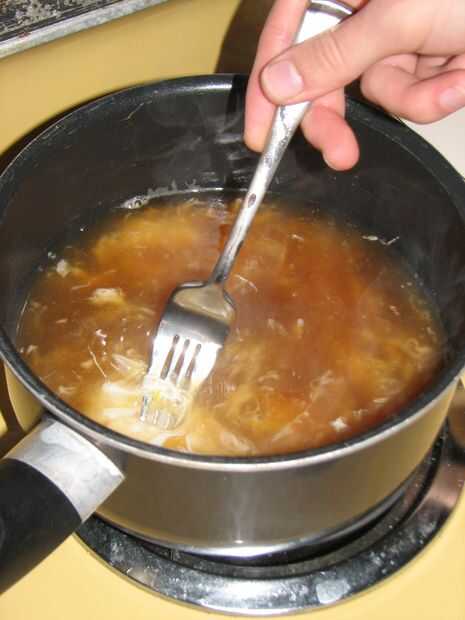 Inmediatamente después de dejar los huevos, revuelva lentamente en una dirección (prefiero a la izquierda, pero es usted). Asegúrese de que romper las yemas temprano. Si le resulta difícil conseguir una buena consistencia (pedacitos de huevo bultos más que suelto de la cinta), tratar de batir el huevo en una taza antes de verter. Si usted hace esto, viértala en lentamente y a un ritmo incluso, revolviendo muy despacio al mismo tiempo.