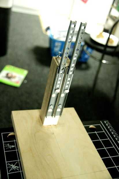 Tomar las diapositivas del cajón y la goma en él. Fije ambas diapositivas del cajón en la parte delantera de la torre. Y luego la goma encima de la torre.