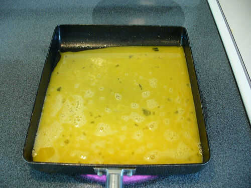 Verter la mezcla uniformemente, no quiere cocinar inmediatamente como golpea la olla, así que no buscas un fuerte (si satisfacer) freír sonidos como golpes, pero un chisporroteo suave. Si está burbujeando hacia arriba, probablemente es demasiado caliente, pero no te preocupes, solo baje el calor, la primera parte del huevo que hits el pan será en el centro del rollo, así que no ser demasiado obvio.