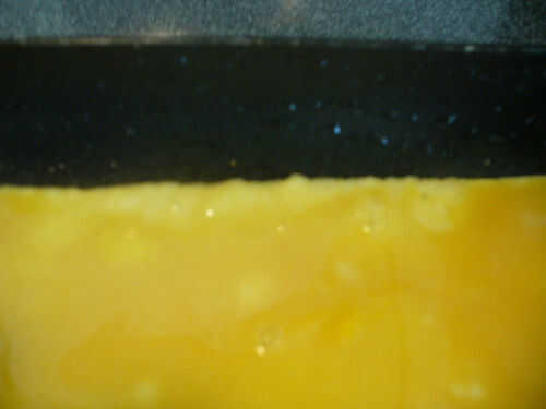 Su pan para esparcir la mezcla de la inclinación, quiere difundirlo el huevo uniformemente alrededor de la cacerola, sin ser demasiado delgada. Esto no debería tomar más de unos segundos. Esperar a cocinar un poco, debe ser opaco y comienzo burbujeante para arriba de debajo como los cocineros de la parte inferior. Ahora viene la diversión parte.