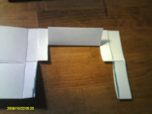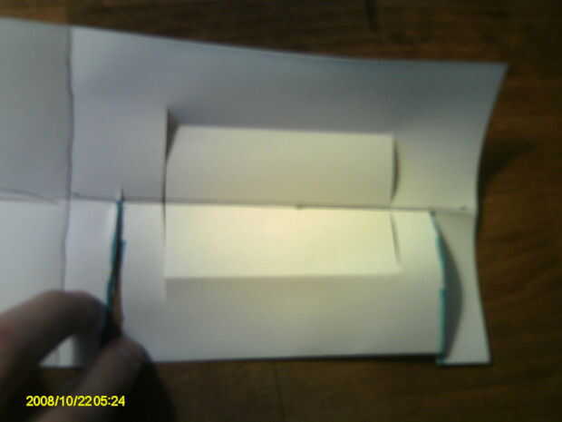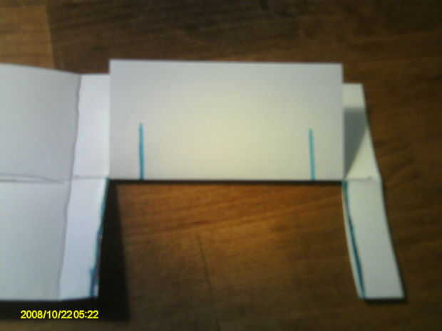 a continuación, cortar otra vez todas las capas en las líneas azules vas aproximadamente hasta la mitad del rectángulo pequeño y doblar para arriba al igual que en el primer paso. Luego doblar las aletas por lo que es volver al perro caliente.