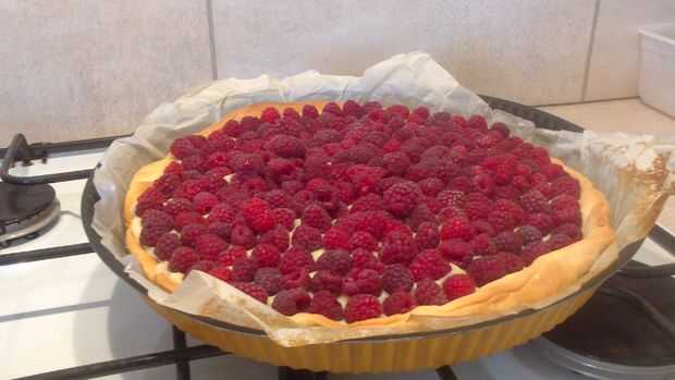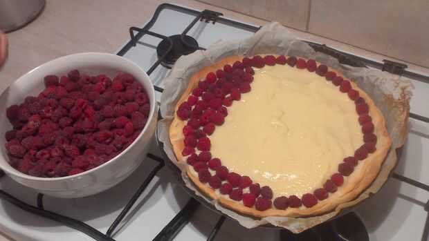 Conseguir las frambuesas y comenzar a poner en la tarta. No simplemente tirarlos en la empanada! Recoger, uno por uno y hacer algo bonito. Comencé por la parte exterior de la tarta. Hacer como es posible que prefiera.