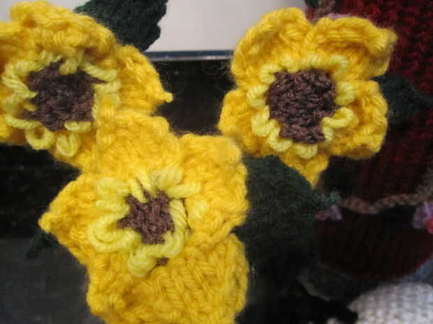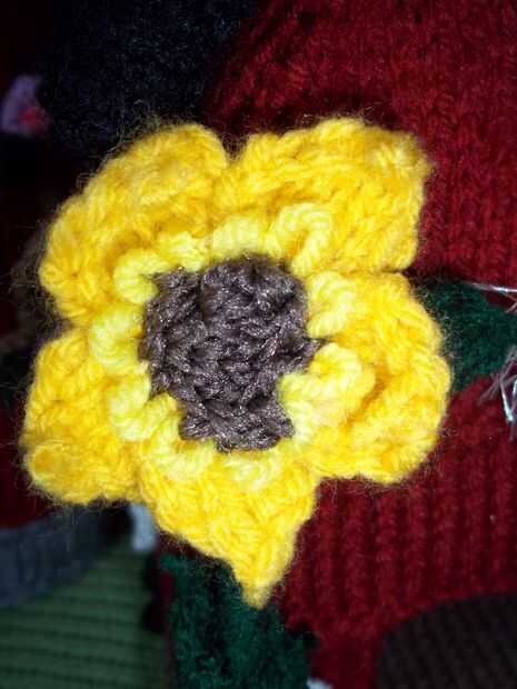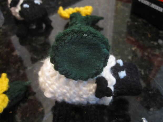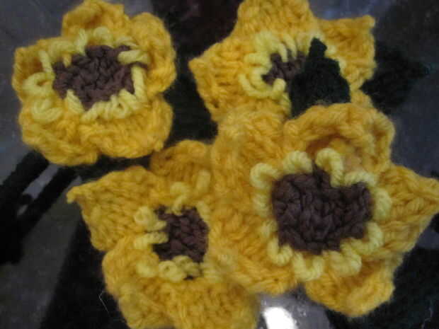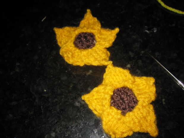 Coser los pétalos en una formación de la corona y luego coser el centro marrón. Hacer pequeños lazos alrededor del centro de la flor teniendo cuidado de no tirar de los puntos de sutura a través de todo el camino. Coser una hoja en la parte posterior del girasol.