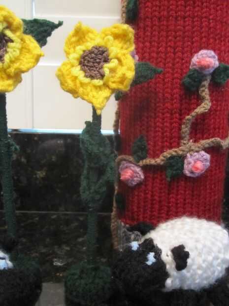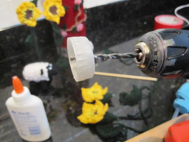 Perforar un agujero en la tapa de soda y asegure la brocheta con pegamento caliente. Agregue un trozo de fieltro verde en la parte inferior de la tapa de soda. Envuelva el pincho de bambú con el hilo verde. Coser la tapa de soda en la parte inferior del girasol para cubrir la tapa. Coser la parte inferior para arriba agradable y apretado.