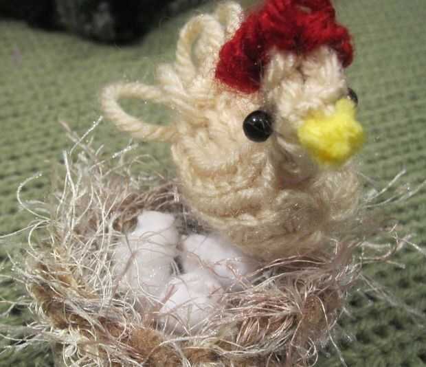 Usando la cola de hilado, usted tendrá que coser el pollo. Hay una foto de este con el gallo. Además, el pollo, gallo y los patos son similares. Una vez que el pollo cosido encima, Mecharla. Usted necesitará utilizar el hilo para aplanar la parte inferior. Puntadas en y hacia fuera y tire firmemente. Poco bucles para plumas de la cola y las plumas de la cabeza. Pegamento en los ojos y añadir el pico. El pico es solo amarillo hilo encadenado a través de la cara y 4 o 5 nudos hechos. Use pegamento para fijar los extremos.