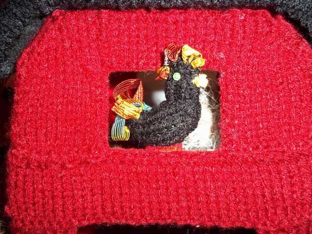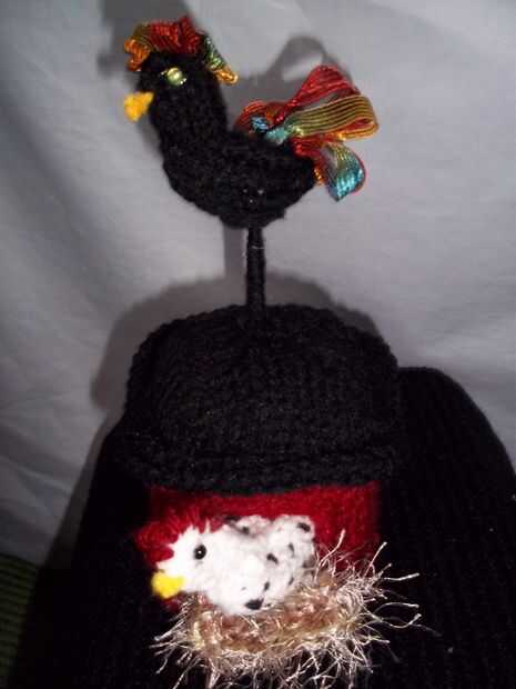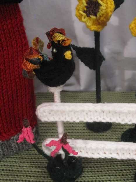 El gallo es el mismo patrón que el pollo. Usé hilo de cinta marca del León para hacer las plumas de la cola. Necesitaba algo extravagante. También, el gallo tiene un imán cosido en su parte inferior por lo que él puede posarse en tres lugares, la parte superior del nido del gallo, el borde de la cerca de Mosbey y en la ventana del pajar.