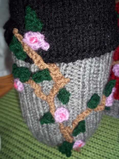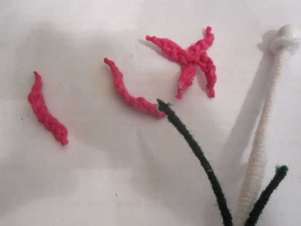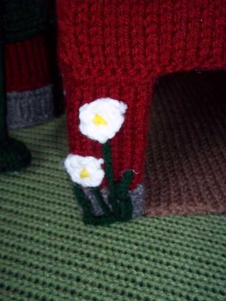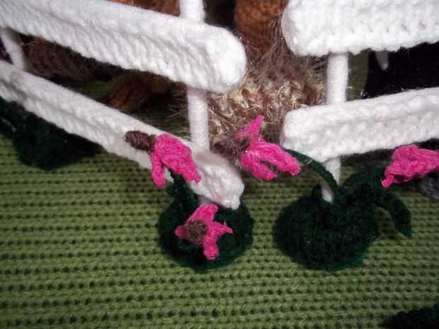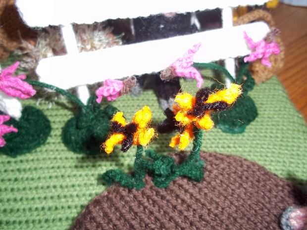 Las hojas de las flores son cadenas de crochet o el mismo patrón utilizado para las hojas de tomate.  Los coneflowers y los lirios son cadenas de crochet y tops anudados.  Hay una foto de la Margarita con el gallinero.