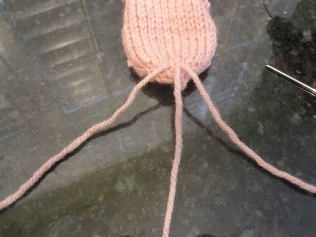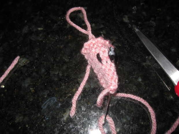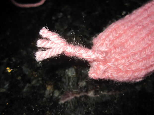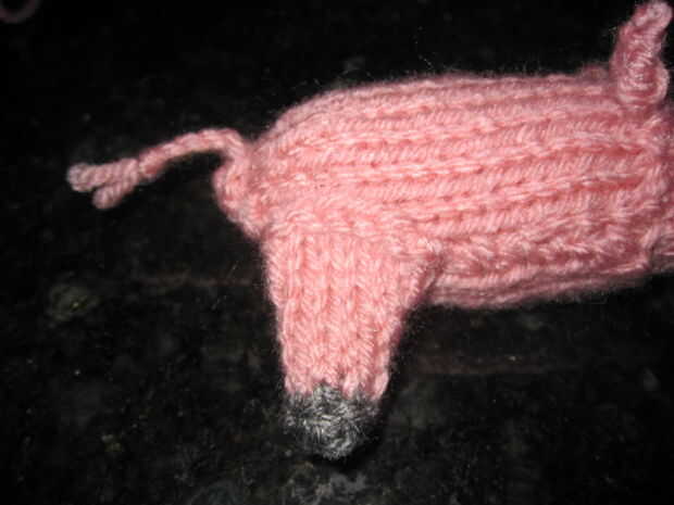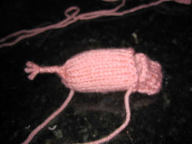 Una vez que tengas todas tus prendas de punto, tienes que hacer la cola en el cuerpo. Tomar la cola de hilado e hilo en la aguja de hilo. Asoman a través del cuerpo del cerdo para que quede centrado en la parte posterior y en el lugar donde desea que la cola para ser. Siguiente cadena otro trozo de hilo a través de la misma área para que usted tenga tres hebras de hilo de la trenza. Hay una foto de esto. Trenza la cola y sujételo con un nudo. Coser el cuerpo, dejando abierto para el relleno del agujero central.