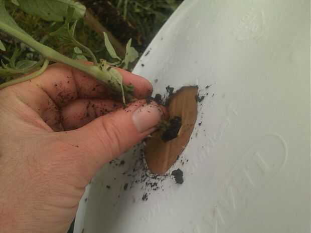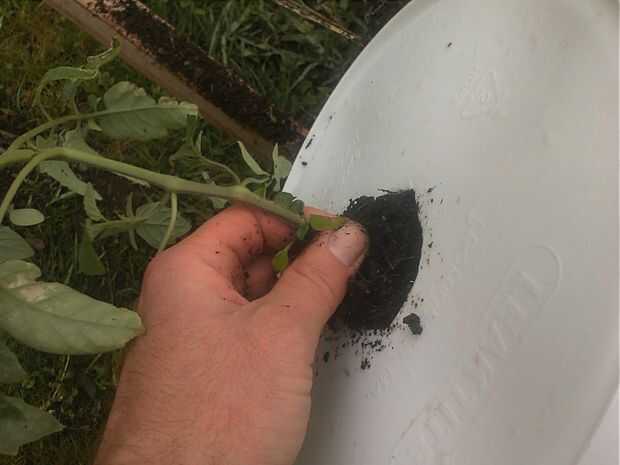 5) la planta de tomate. Retire cuidadosamente de la olla anterior. Aflojar sus raíces, eliminando toda la suciedad extra en su fuente de suciedad. Trabajar suavemente las raíces en desde abajo, apoyando el tallo mientras que haces. Ahora deslice un trozo de cartón sobre el tallo, en el interior del cubo. Repita con el segundo pedazo dado vuelto 90 grados de la primera. Muchas veces ellos se terminan que se enclavija, que es fresco pero innecesario.
