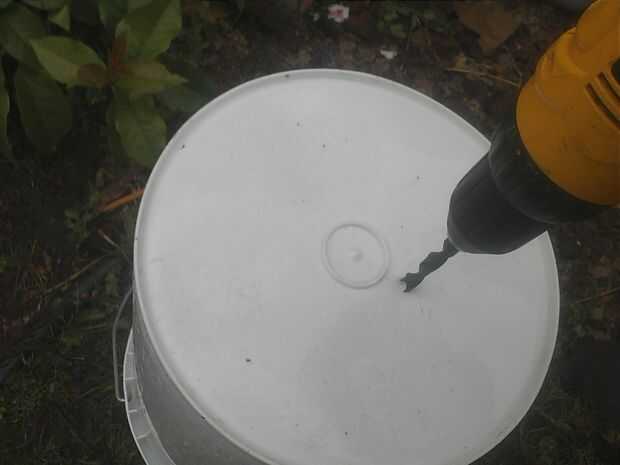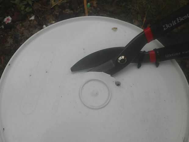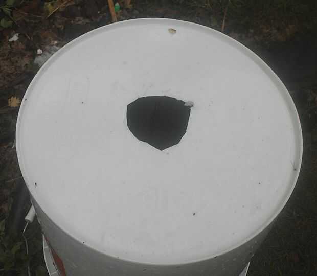 4) cubo de los 5 galones. Cortar un agujero en el centro de la parte inferior, aproximadamente 2 "x 2" o 5 x 5 cm. Mi técnica fue taladrar un agujero con mi broca más grande y luego allí con unas tijeras para hacer el corte.