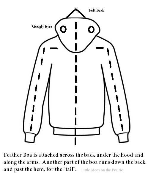 1. Enhebre la aguja y usar para sujetar la boa a la espalda y los brazos de la sudadera con capucha, en forma de T en la parte posterior. Esto le da 2 alas y una cola! Sólo lo anclados en varios lugares con puntadas apretadas.