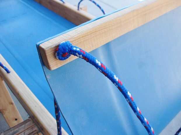 Las dos cuerdas que hacen que la cuerda de remolque se instalan a través de estos agujeros, y la parte delantera de la pista de trineo es tirada para arriba y curvada a su gusto y sostenida en lugar por los nudos atados en estas dos cuerdas. Los dos extremos sueltos luego son atados juntos.