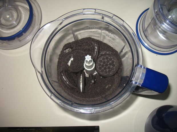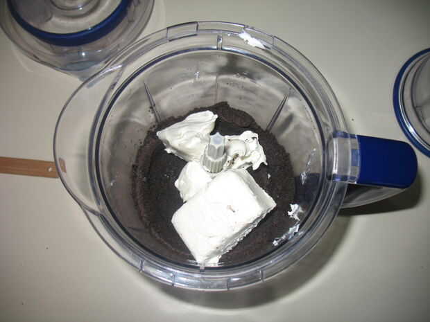 Utilicé una batidora, pero está diseñado para que la masa es fácil de sacar. Moler las galletas a polvo, echar el queso crema y mezclar hasta que se convierte en una masa. Eso es todo! Lo hice mientras se cocina el tocino.