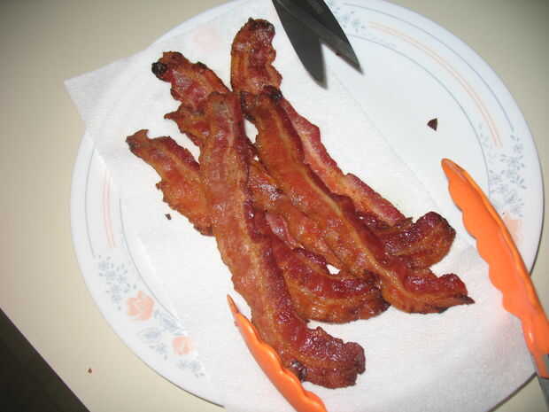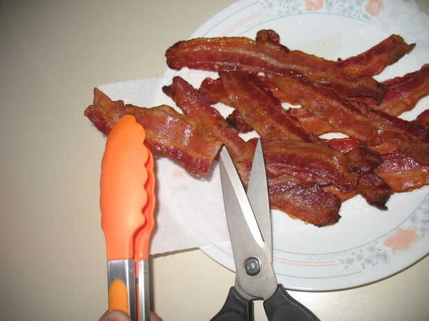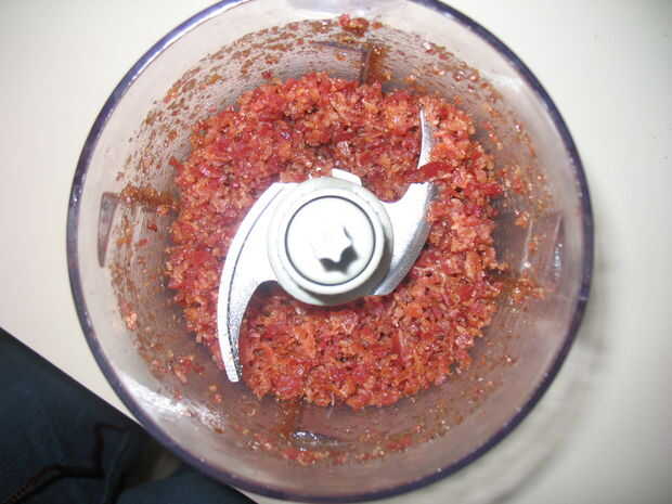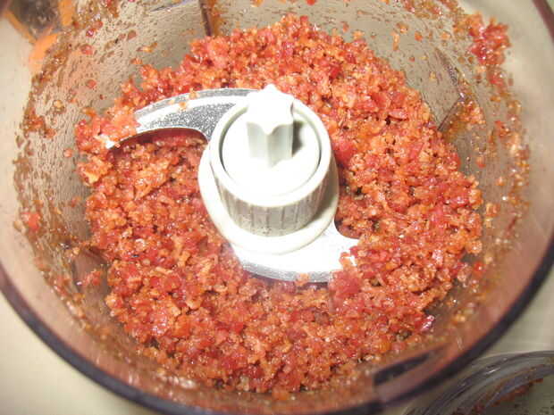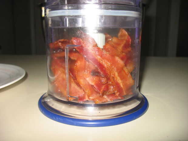 Normalmente un cuchillo y hacer algunos deformes, trozos de tocino, pero esta vez quise experimentar con el procesador de alimentos. Funcionó a la perfección. Cortar cada tira por la mitad primero usando visillos para que realmente encajaría en el procesador diminuto. Sostenía cada tira con pinzas. Hasta ahora, no toqué nada grasoso para no tener que vuelva a limpiar y jabón las manos.