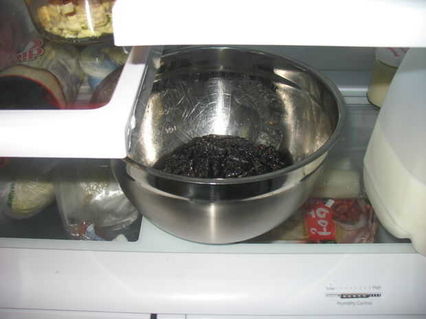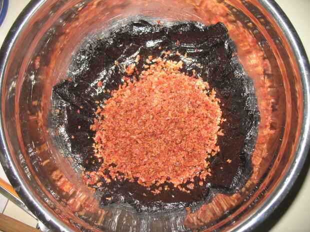 Una vez la masa ha puesto firme para arriba un poco, rodar en bolas pequeñas, uniformes no mayores de un cuarto de diámetro y colocar en el envase/recipiente. Porque se agrega una libra de tocino, este lote salió con mucha más masa que de costumbre.