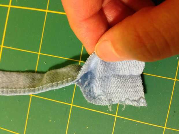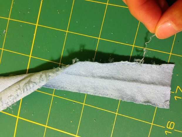 8. Sujete la pieza sobre un bote de basura, coge el hilo de rosca en el extremo y tire para quitar todos los flecos de hilo poco (ahora que tienes una cinta para utilizar!)