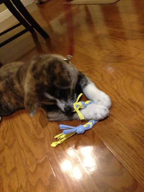 4. Si usted w ant la cola a ser la misma longitud que el otro lado, usted puede recortar las tiras, pero lo dejé para Kiwi jugar con. Ella es ahora la dentición y le encanta su juguete nuevo!!