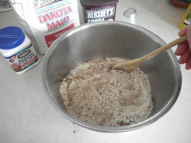 En un bol grande mezclar harina, cocoa, polvo de hornear, azúcar y sal.