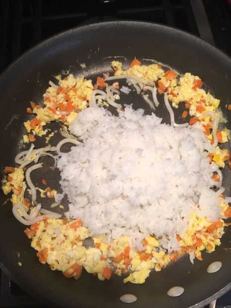 A continuación añadir el arroz. El arroz puede ser blanco o marrón es totalmente hasta el cocinero. Mezclar el arroz y todos los ingredientes para que todo se distribuya uniformemente.