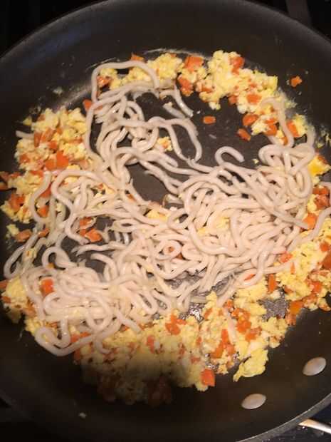 Siguiente paso añadiendo los fideos Udon japonés. Fideos Udon no necesitan cualquier cocina extra así que esto hace fácil añadir en el plato. Una vez que añades los fideos, puede revolverlos todos juntos.