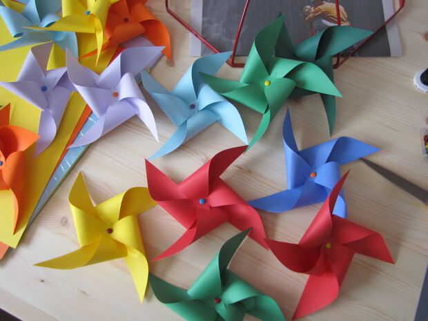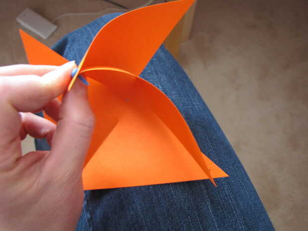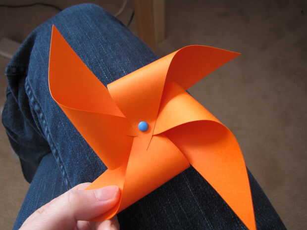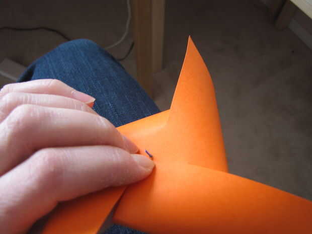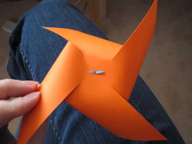 Tomar uno de sus broches y empujar a través del primer agujero, con las 'piernas' de brad mirando hacia usted. (siga los pasos con las imágenes, es difícil de explicar!) Luego meter el brad a través del siguiente agujero, luego el tercero y por último, la cuarta esquina. Después de haber cogido todos los rincones de su brad, asoman por el agujero del centro y aplanar las piernas. Molinete con encanto! Repita estos pasos y terminar sus molinetes.