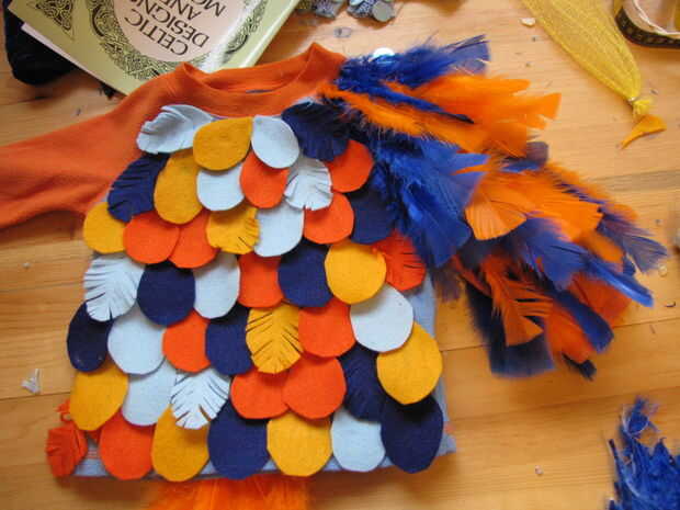 Empecé en el manguito y plumas caliente pegado en uno a uno, alternando colores. Dejé el área debajo del brazo libre de plumas, como que sólo llegar agitados y empiezan a mudar.