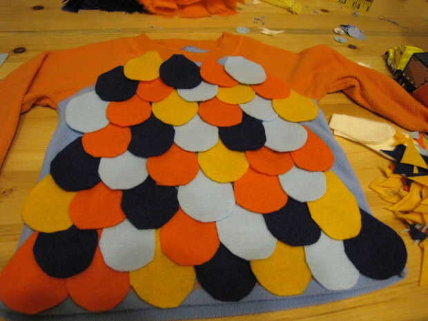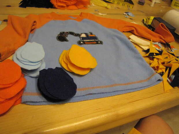 Utiliza una forma de lágrima y cortar 'plumas' de la camiseta. Colocaba al azar, pero podría hacer un sólido, buho de un solo color, o rayas o filas si desea que se vea un poco más ordenada. Yo no podía decidir precipitadamente o willy nilly, pero después de pensar en mi niño, sentía que willy nilly sería mejor.