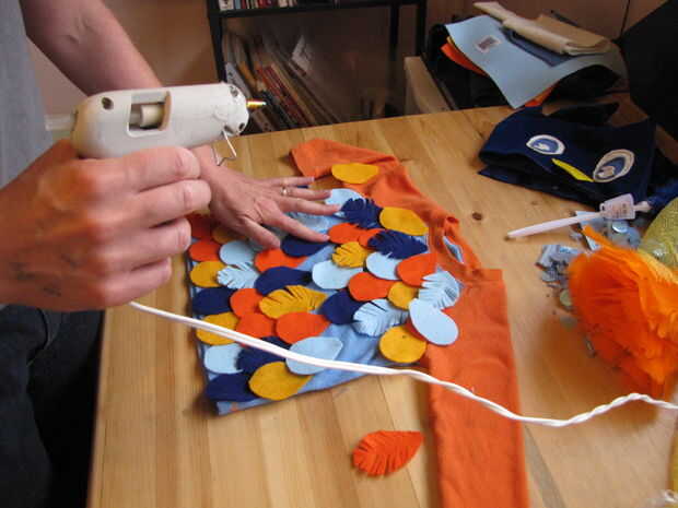 Conecte la pistola encoladora, y a partir de la fila inferior, coloque una tira de pegamento caliente para arriba la parte posterior de la pluma y trabajando en filas, comienzan a subir hacia el cuello. Retocarlo un poco alrededor del cuello para terminar de manera uniforme. Acabé mi última fila de plumas del corte en lágrimas más pequeñas por lo que encajaría. En este punto realmente me amar el ambiente de los años 70 de este traje!